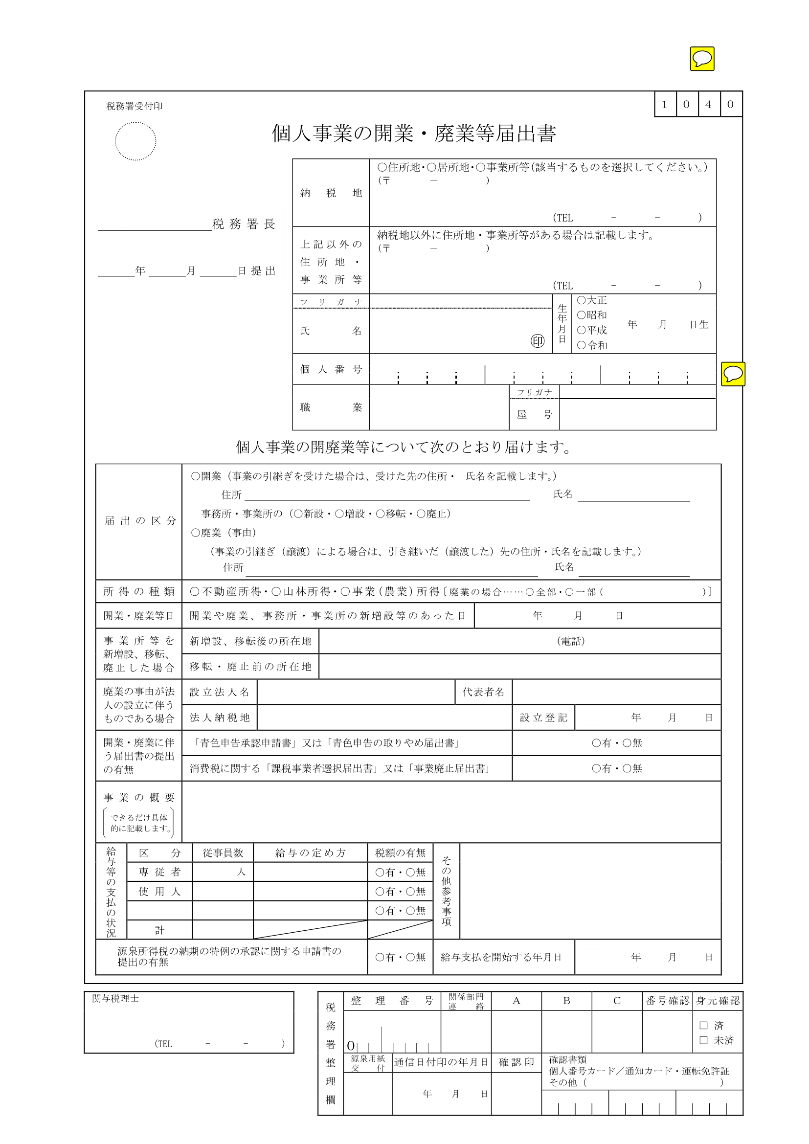 個人事業の開業届け出・廃業等届出書