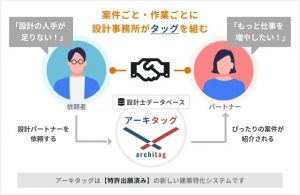 設計事務所・企業の方は無料で『アーキタッグ』に登録し、完全成功報酬型でサービスを利用することができるという、特許出願済みの新しいサービスです。